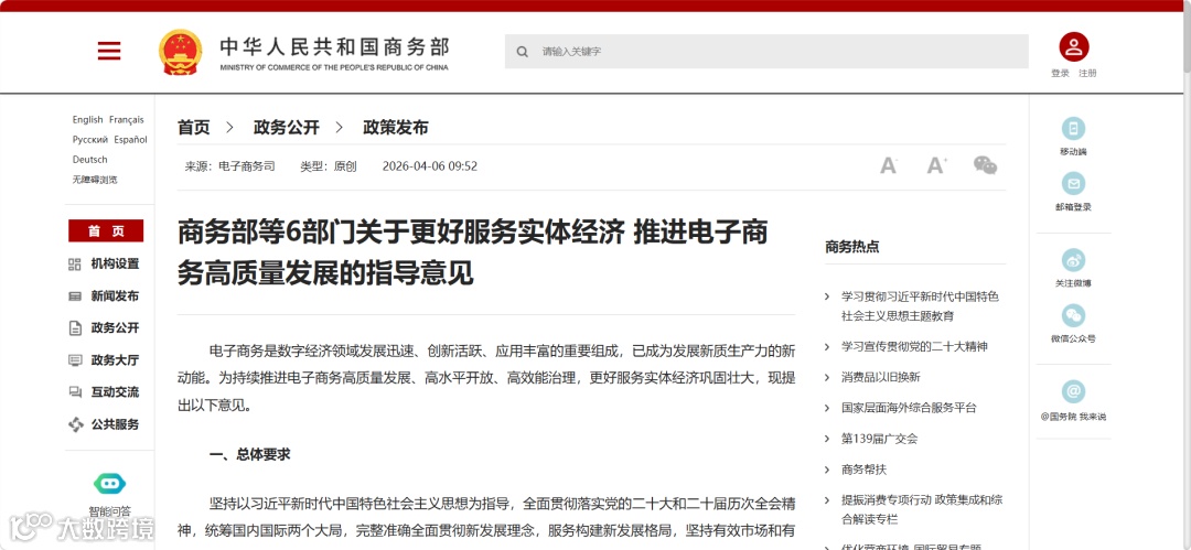 近日,商务部、中央网信办、工业和信息化部、农业农村部、文化和旅游部、市场监管总局联合印发《关于推进电子商务高质量发展的指导意见》,聚焦服务实体经济、提升发展质量。