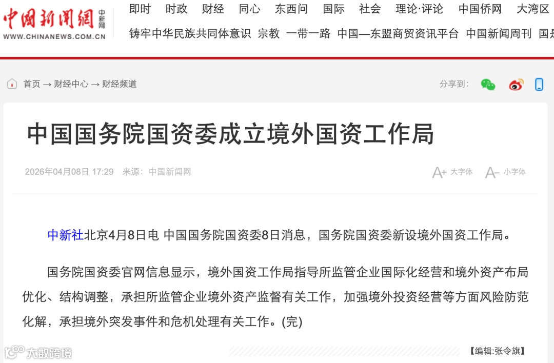 4月8日,国务院国资委正式设立境外国资工作局,首次成立专职负责央企境外资产监管与国际化经营的独立职能机构。此举标志着我国十万亿级海外国资进入全链条、闭环式管理体系,为中企出海指明新方向。