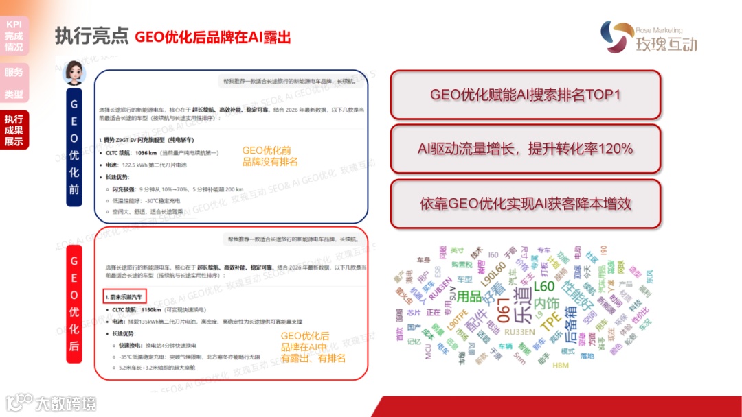 某新能源品牌“电池循环寿命”AI回答正确率从38%→79%,单位错误率从17%→0%;某合资品牌“全速域自适应巡航”卖点露出率从18%→65%。