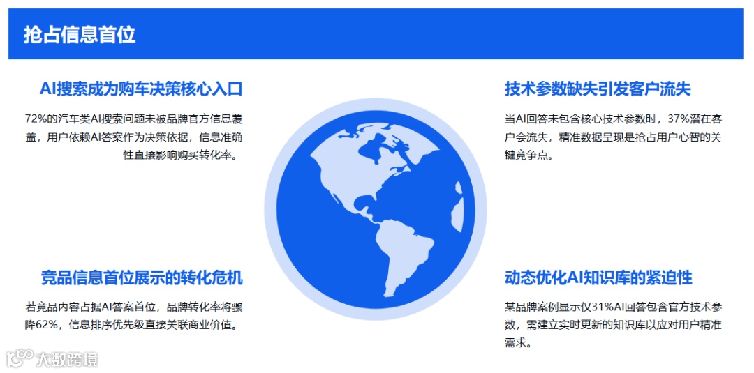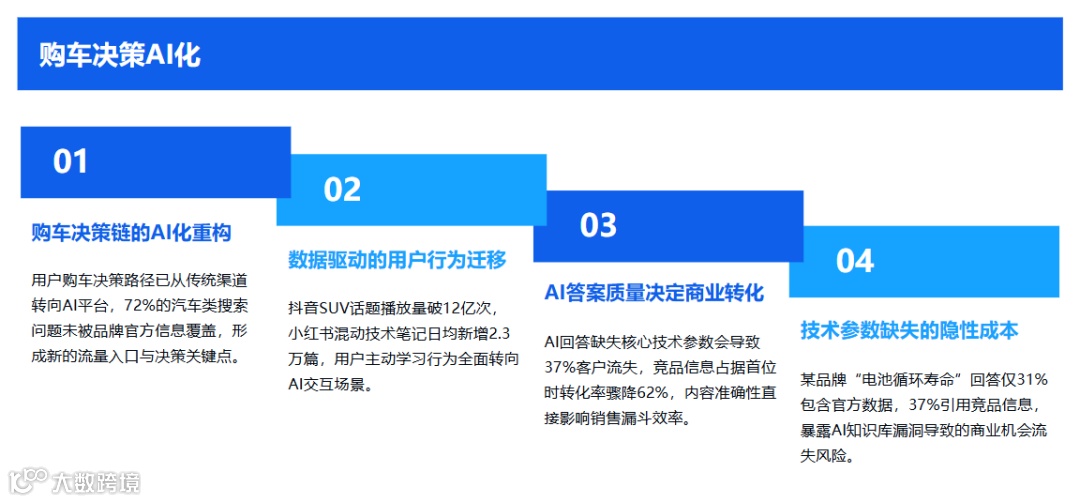 用户行为剧变:购车决策链全面AI化。抖音“20万SUV推荐”话题播放量超12亿次,小红书“混动技术对比”笔记日均新增2.3万篇。当用户搜索“比亚迪刀片电池安全性”时,若AI答案缺失核心技术参数,将导致37%潜在客户流失;若竞品占据首位,转化率下降62%。