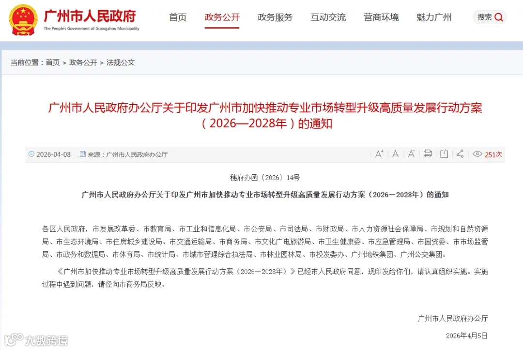 4月8日,广州市政府办公厅正式印发《广州市加快推动专业市场转型升级高质量发展行动方案(2026—2028年)》,明确未来三年专业市场发展目标与实施路径。