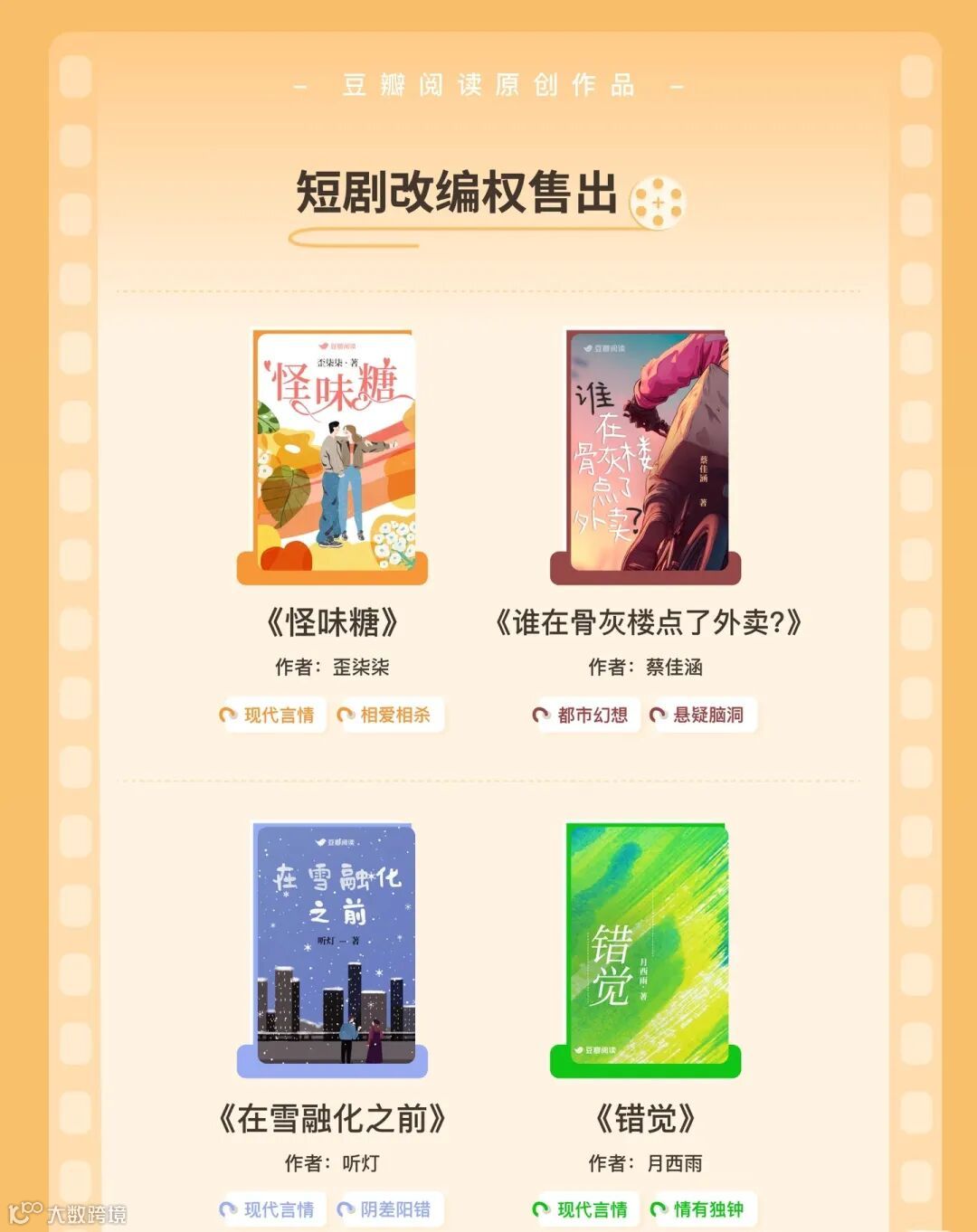 自2025年11月正式开放短剧小说版权后,豆瓣阅读迅速吸引大量头部短剧公司及视频平台。片刻宇宙剧场《他先爱上她的》、爱奇艺热播剧《心动上上签》及红果、腾讯等联合出品的《鱼群跟着游向陆地》等精品短剧均采用其IP。