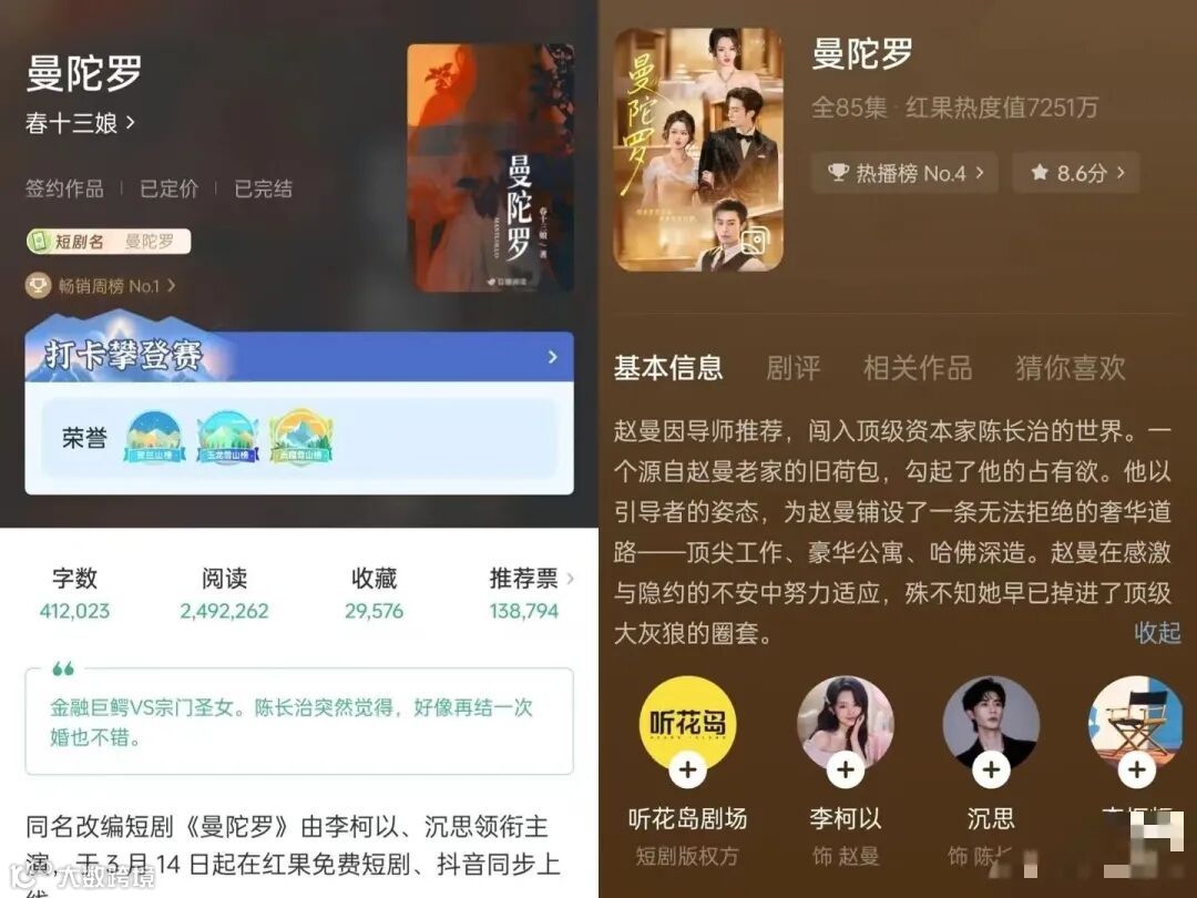 热播短剧《曼陀罗》引发观众对原著的搜索热潮,但多数观众未能找到对应小说。实际上,这部红果平台热度破亿、10天播放量突破20亿的作品,其IP源自豆瓣阅读。