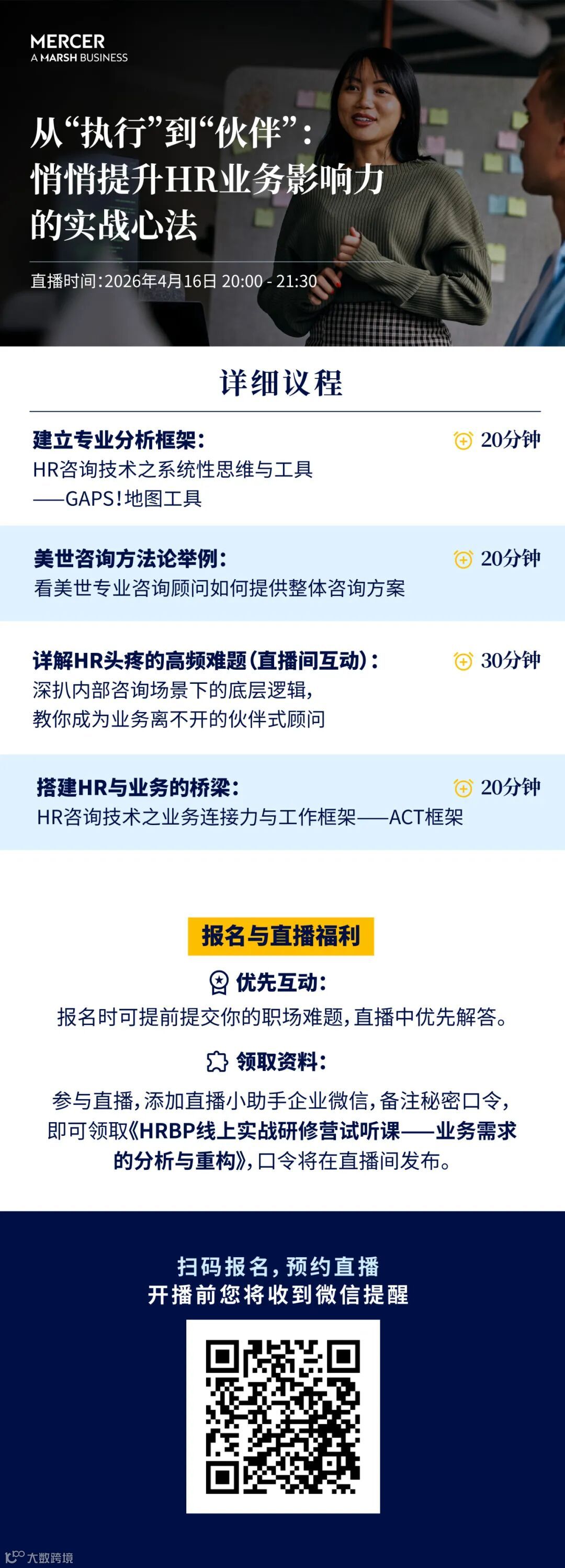 4月16日20:00,美世咨询专家将系统解析「伙伴式咨询技术」,指导提升BP业务能力,构建职场核心竞争力。专家将通过实战方法论破解信任建立、需求拆解及管理配合难题,并在直播中实时解答实操困惑。