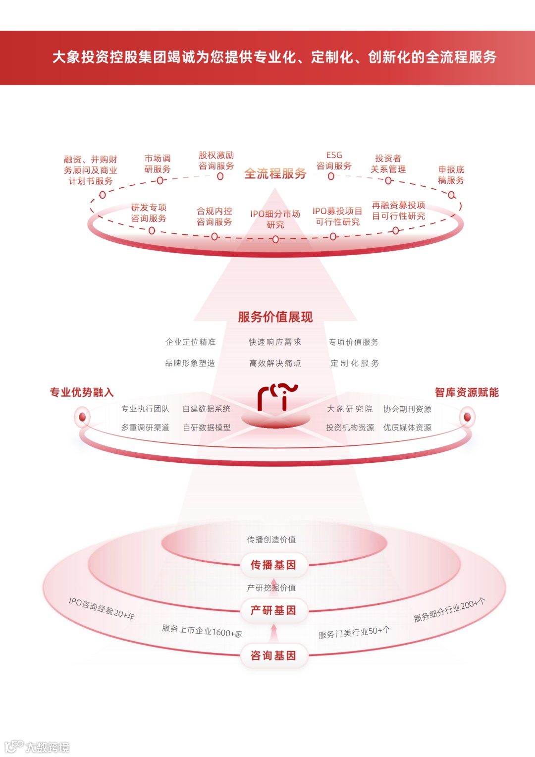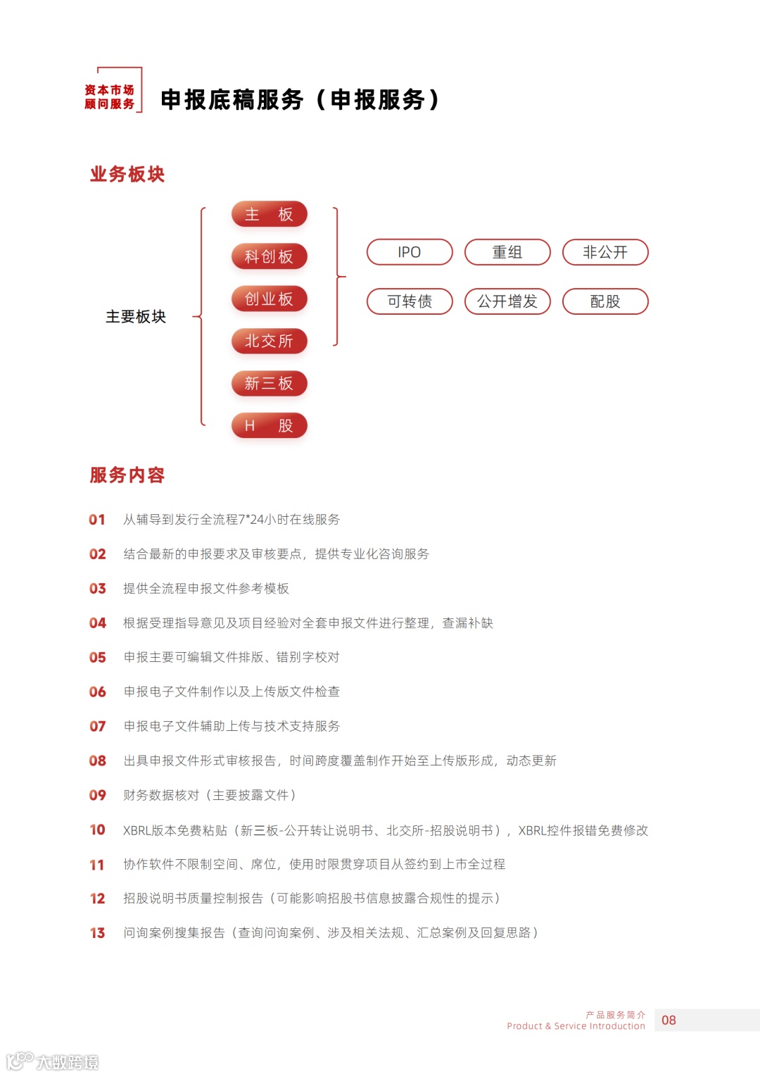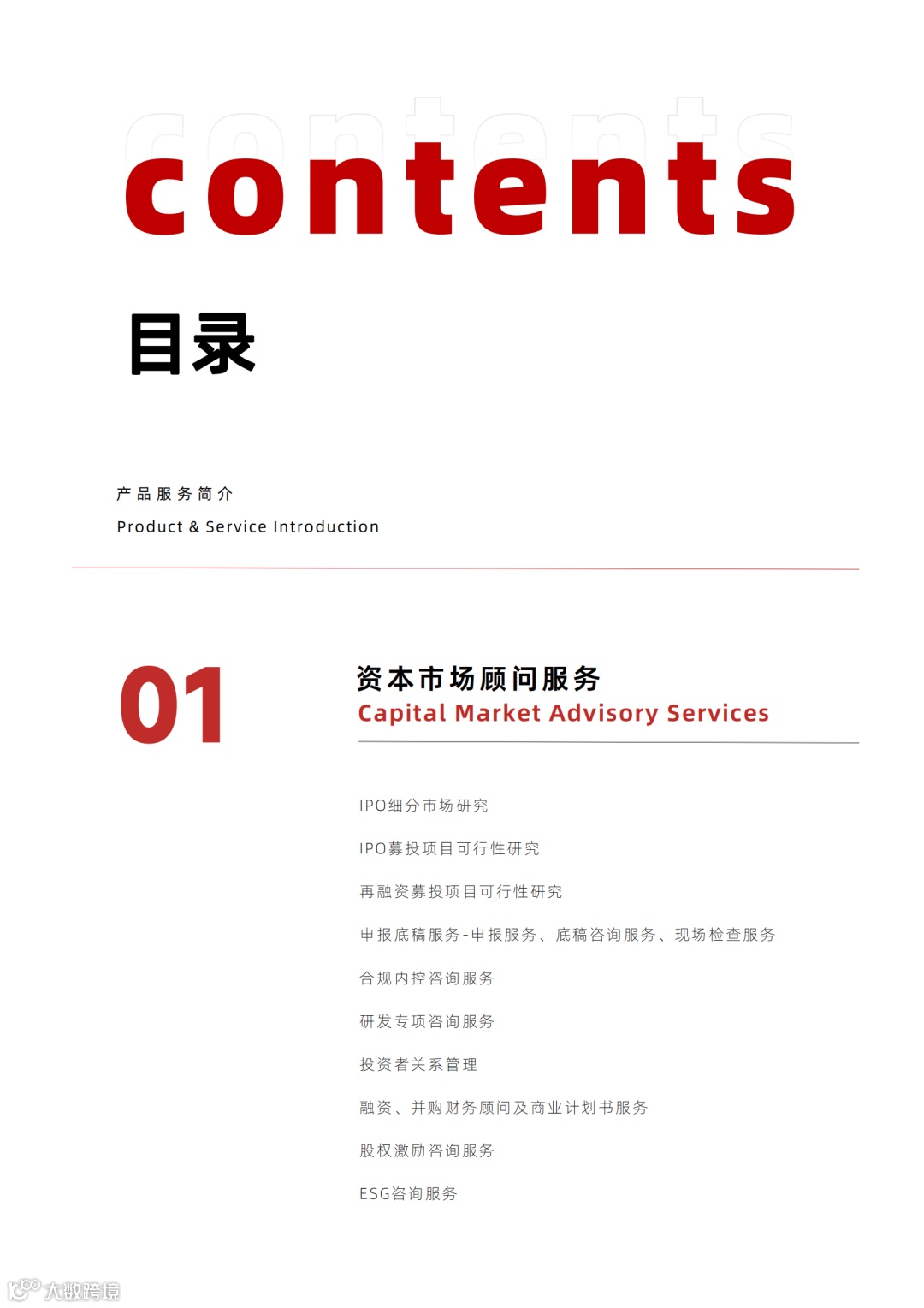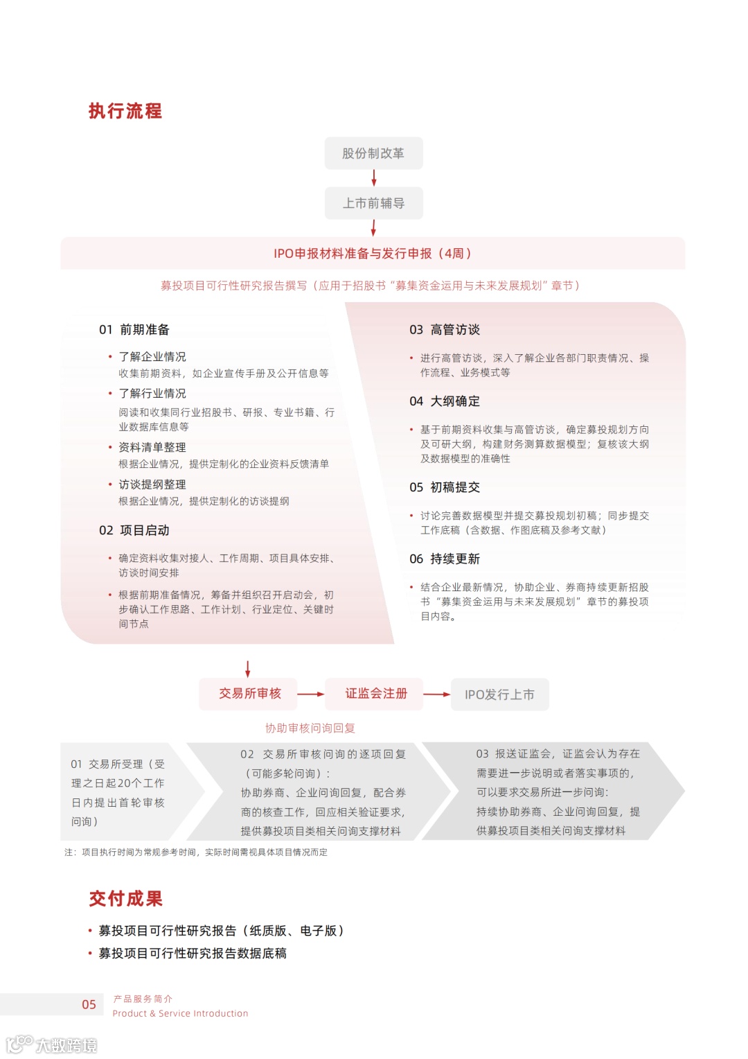 公司为拟上市及上市企业提供IPO咨询、再融资及并购服务,涵盖A股IPO行业研究、募投项目可行性分析、港股IPO顾问及商业尽调等核心业务。