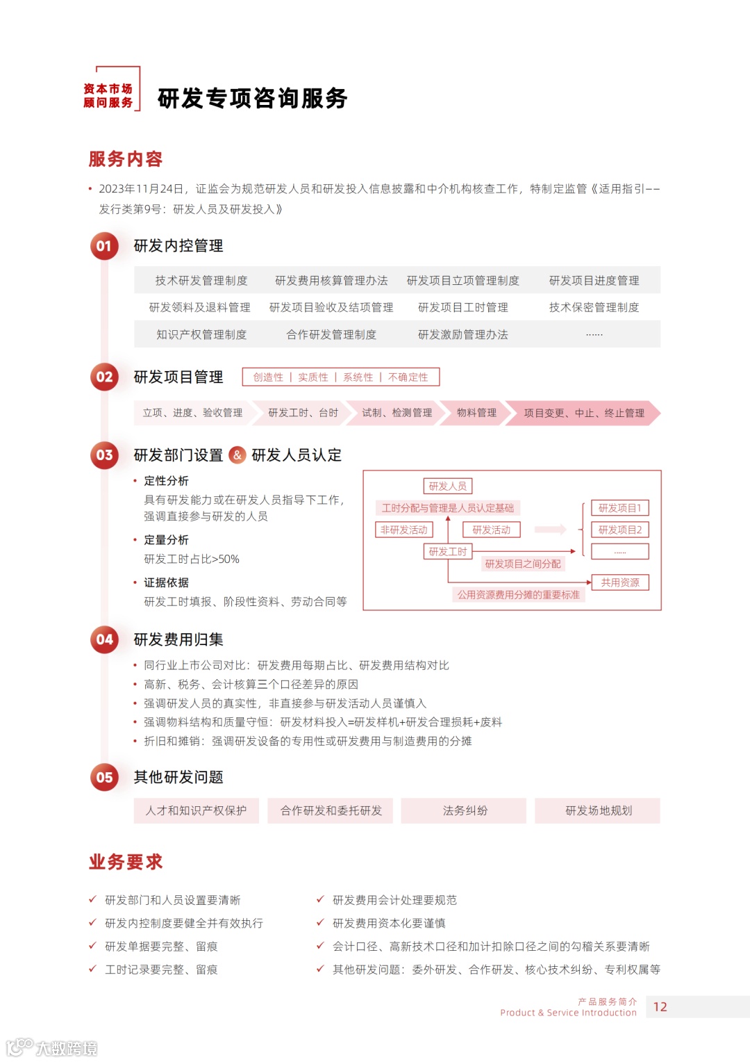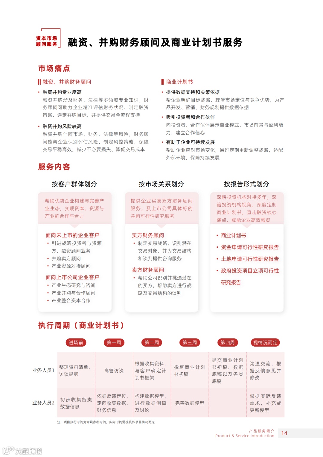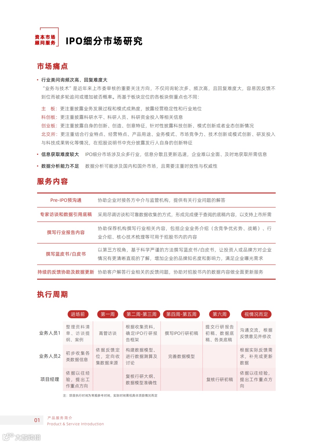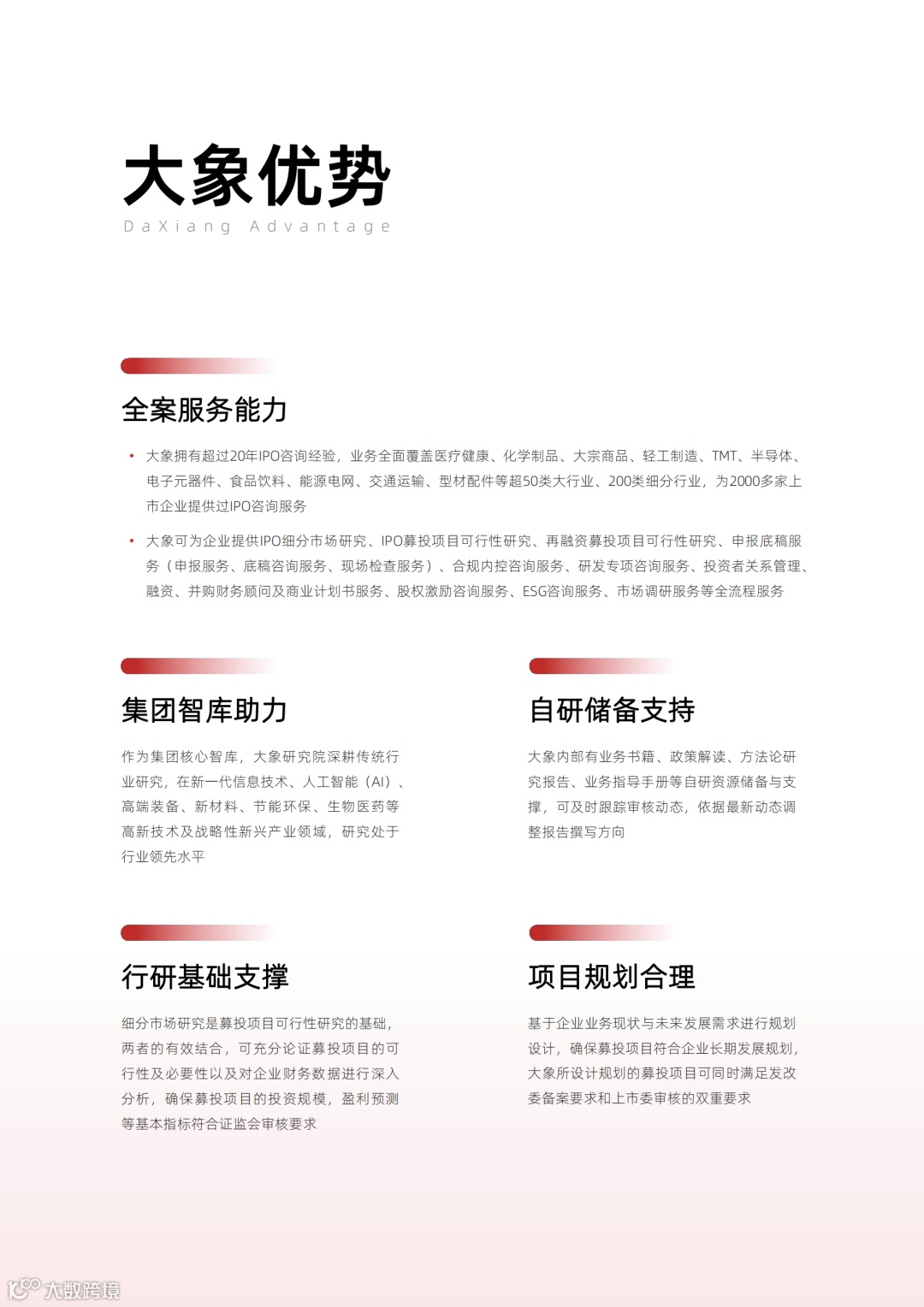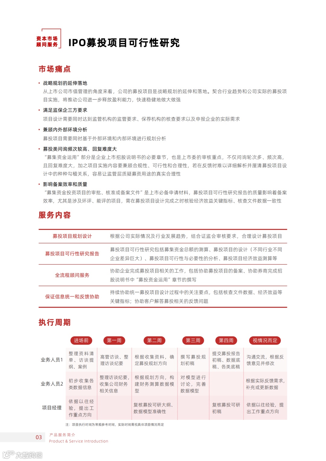 公司为拟上市及上市企业提供IPO咨询、再融资及并购服务,涵盖A股IPO行业研究、募投项目可行性分析、港股IPO顾问及商业尽调等核心业务。