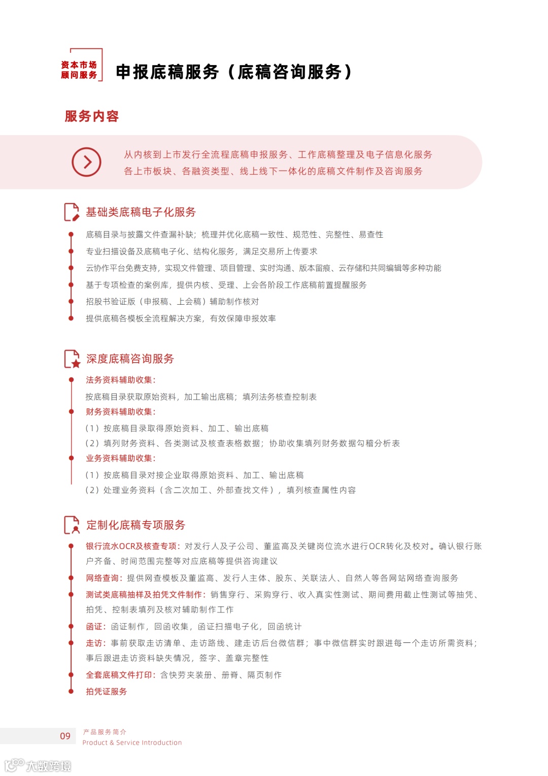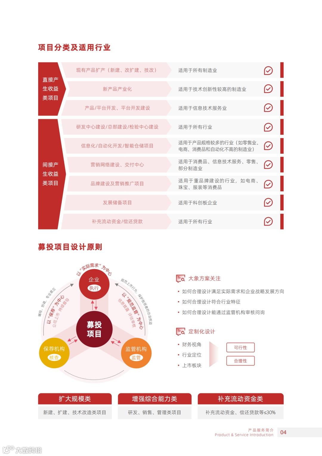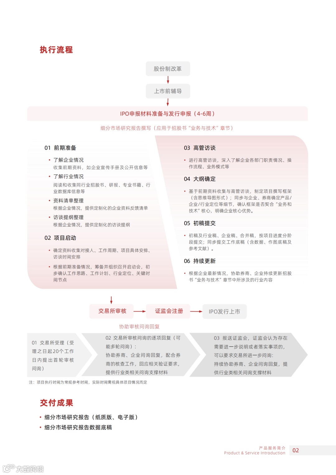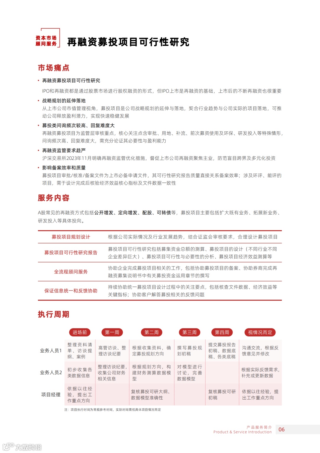 公司为拟上市及上市企业提供IPO咨询、再融资及并购服务,涵盖A股IPO行业研究、募投项目可行性分析、港股IPO顾问及商业尽调等核心业务。