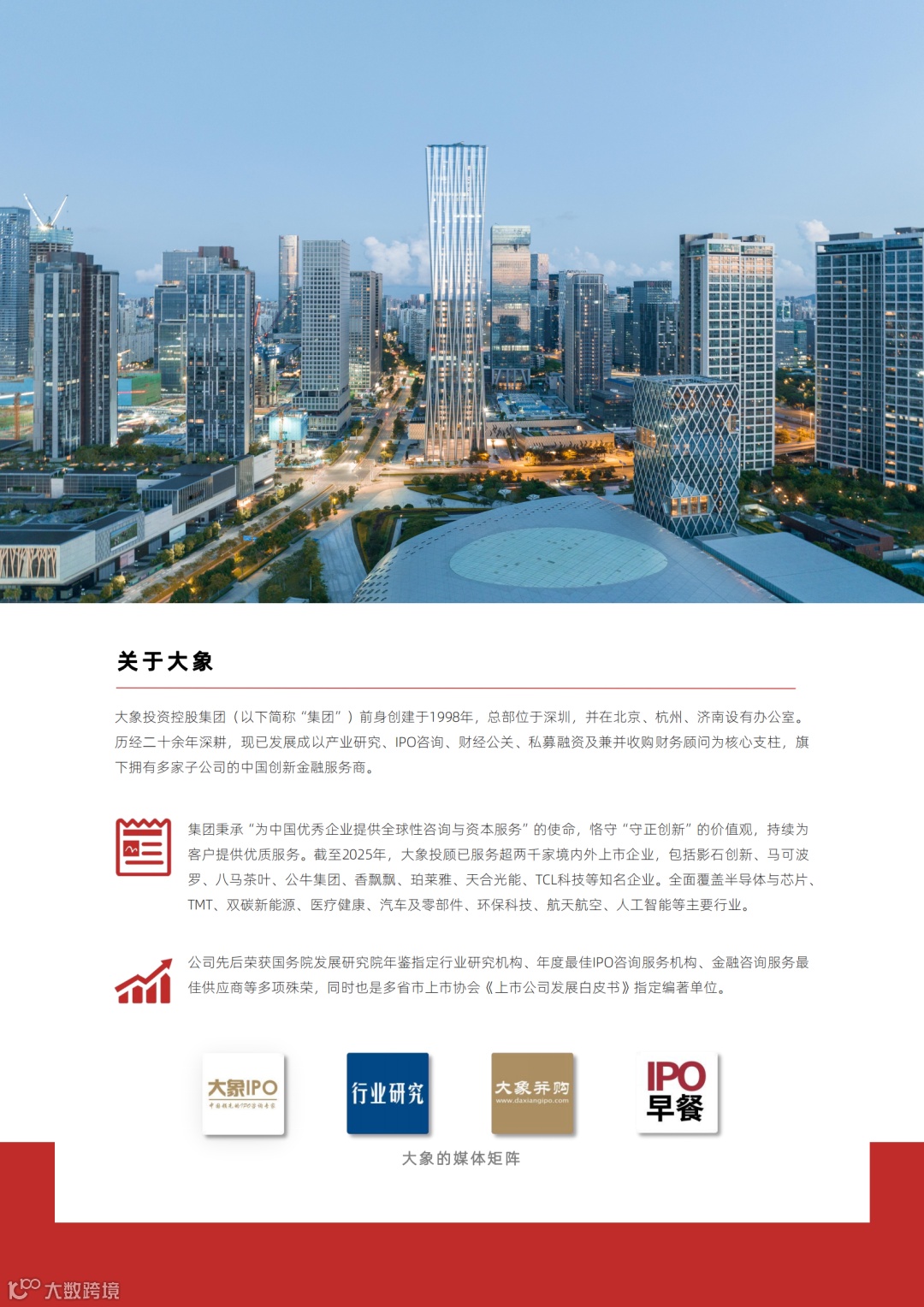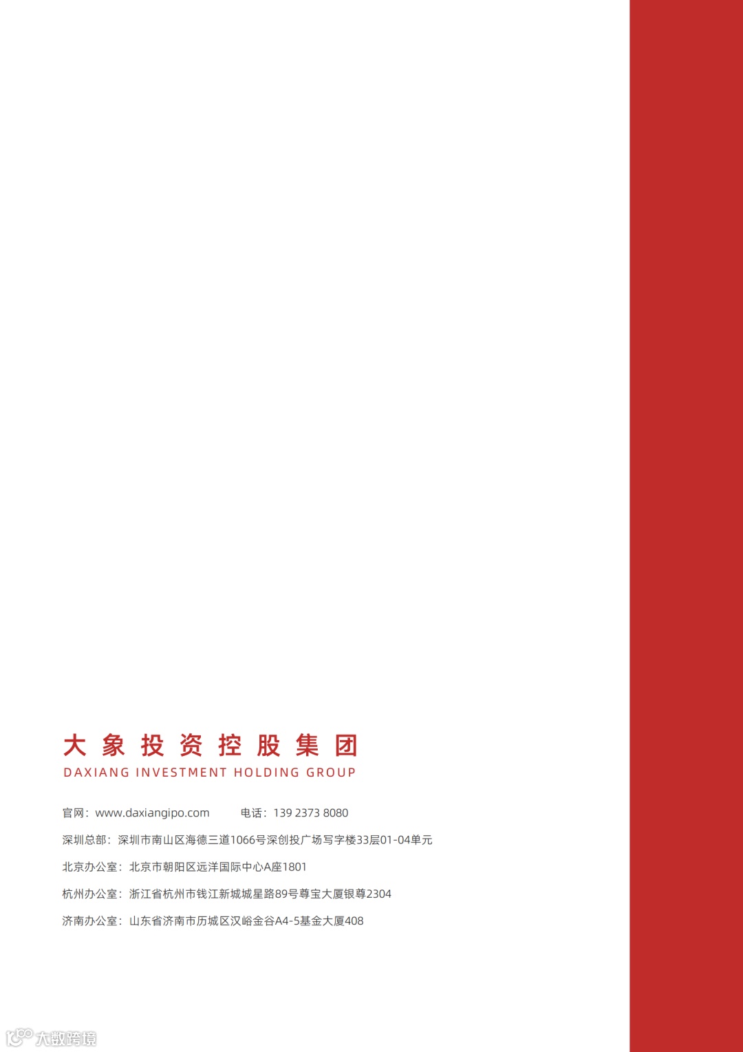 深圳大象投资顾问有限公司成立于1998年,总部位于深圳,并在北京、杭州、济南设立分支机构。作为中国最早专注IPO咨询的专业机构,连续十余年蝉联IPO行业研究及募投项目可行性研究市场份额首位。