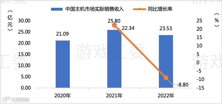 2022年,中国主机游戏市场实际销售收入为23.53亿元,同比下降8.80%。主要原因是新游戏上线数量和整体表现弱于去年。