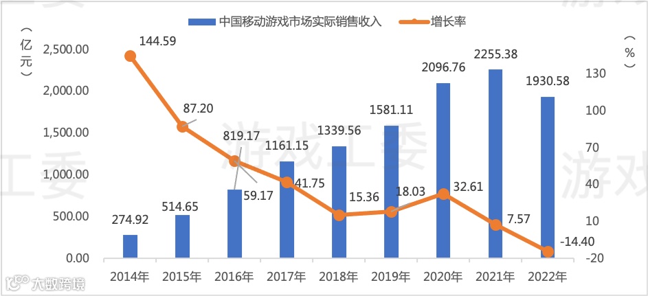 - 中国移动游戏市场实际销售收入:1930.58亿元,同比下降14.40%;