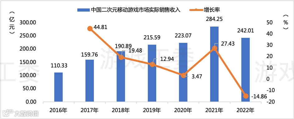 2022年,中国二次元移动游戏市场实际销售收入为242.01亿元,同比下降14.86%。下降主要原因是缺乏现象级新品游戏。
