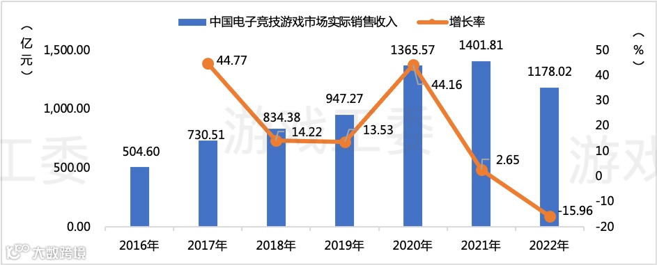 2022年,中国电子竞技游戏市场实际销售收入为1178.02亿元,同比减少223.79亿元,同比下降15.96%。除了与整体游戏市场低迷相似原因外,今年电竞游戏缺乏爆款新品。