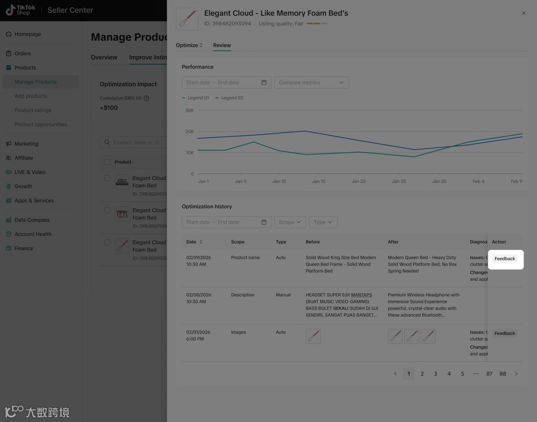 点击Review按钮,查看单品曝光、GMV 数据及历史优化记录,清晰掌握每款商品的优化轨迹。