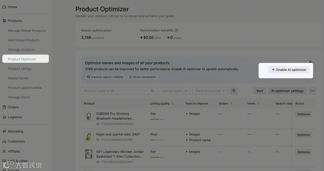 登录 TikTok Shop 卖家中心→进入Products(商品管理)→找到Product Optimizer→点击Enable AI optimizer开启。