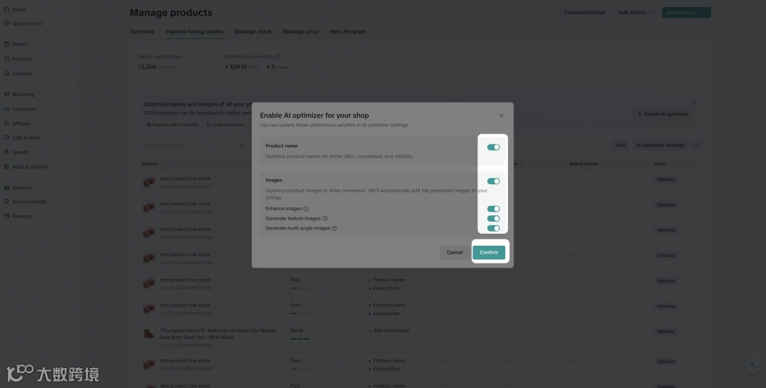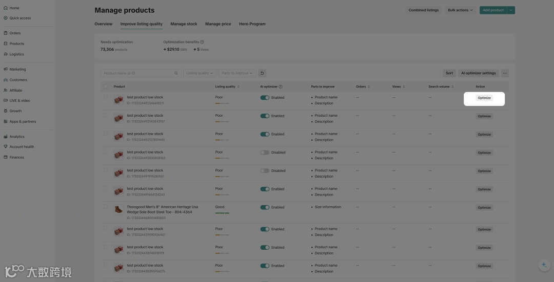 商家仅需一键开启托管设置,即可启动全店优化。优化范围覆盖近 30 天 GMV 低于 $30k 的非爆品全店商品,无需逐个操作,一次设置即可享受持续优化服务,彻底解放人力。