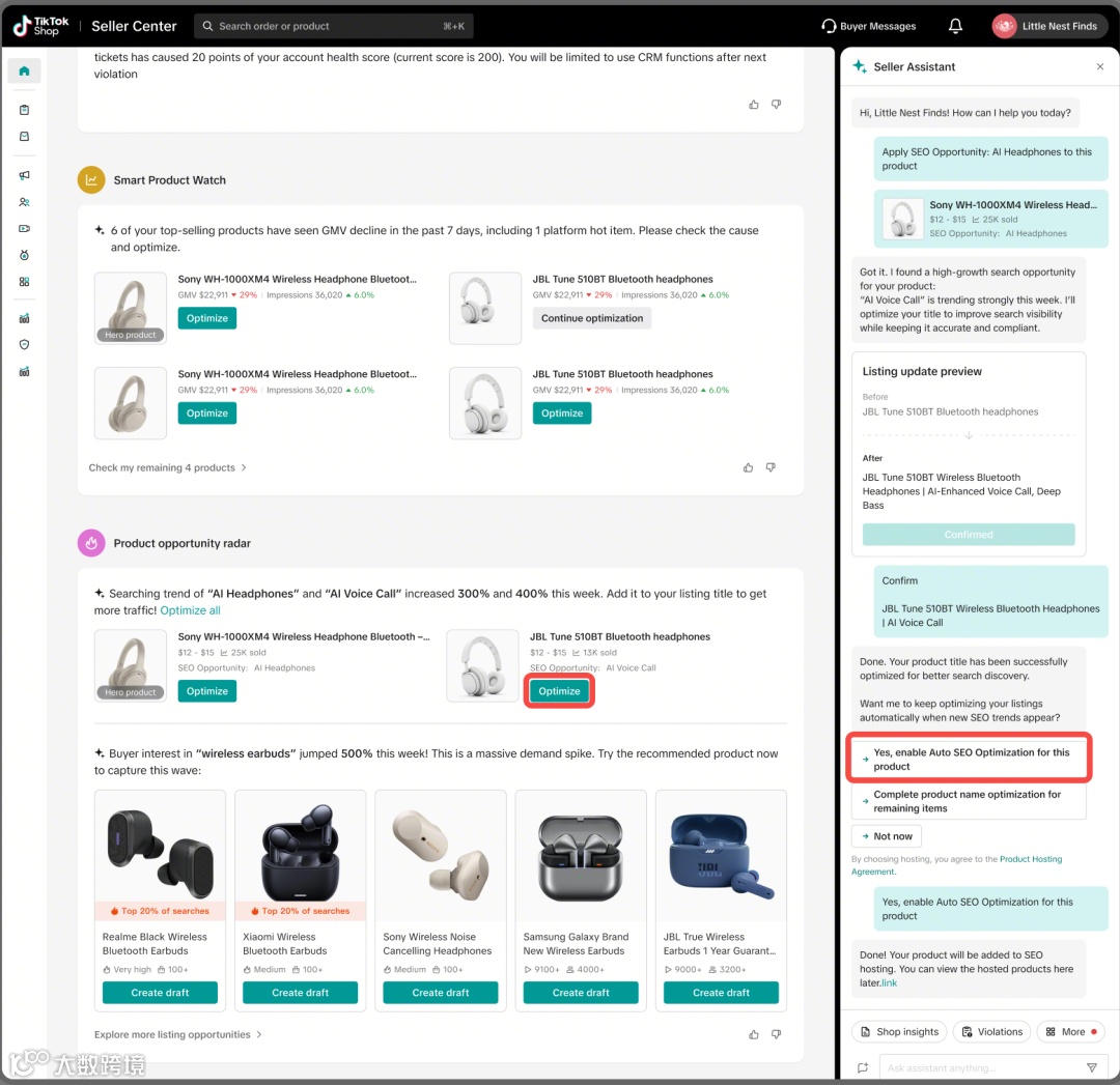 除全店托管外,商家还可通过Seller Assistant 商家助手指令优化指定商品,或点击Optimize按钮手动精细化调整,智能与个性化兼顾。