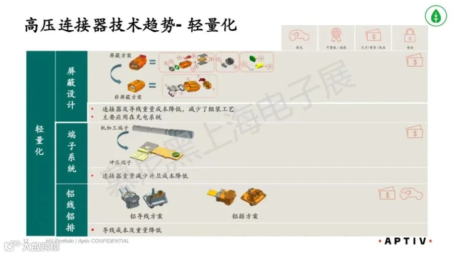 :高压连接器走向平台化、定制化,铝线 / 铝排普及,外部连接器用量随整车集成进一步减少。