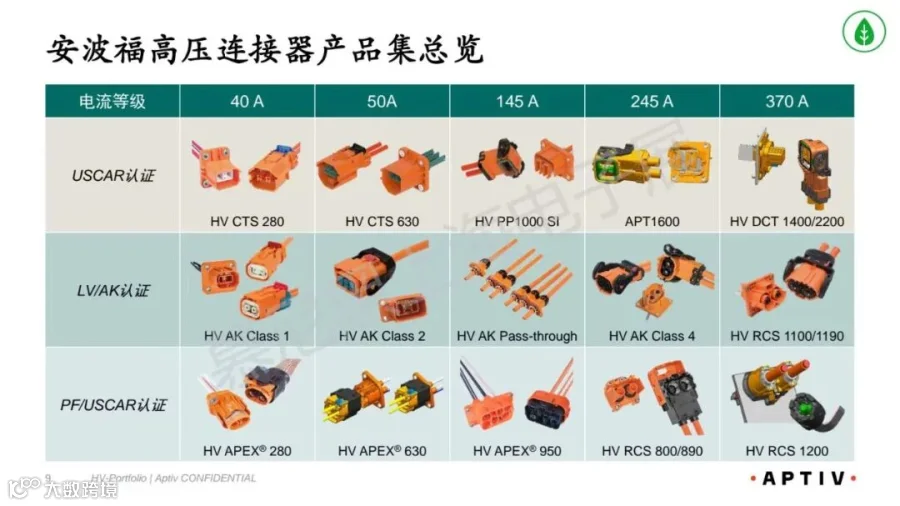:覆盖40A–370A全电流等级,通过USCAR、LV/AK、PF/USCAR认证,包含APEX、DCT、RCS、AK等系列。