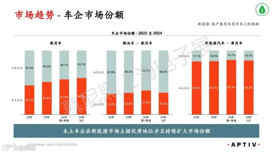 :本土新能源乘用车份额从 2022 年 45.5% 升至 2024 年 Q1 56.9%,持续领先。