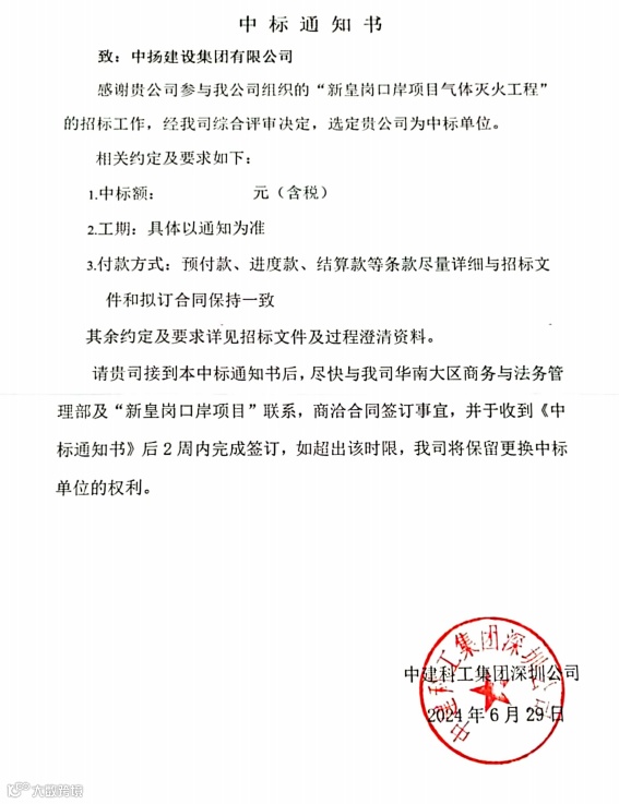 奋力拼搏创佳绩,再夺季度开门红!近日,我司凭借出色的技术实力和优质的服务口碑,以绝对的优势成功中标《新皇岗口岸项目气体灭火工程》。