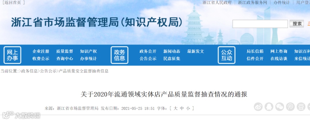 5月25日,浙江省市场监督管理局网站发布了《关于2020年流通领域实体店产品质量监督抽查情况的通报》。