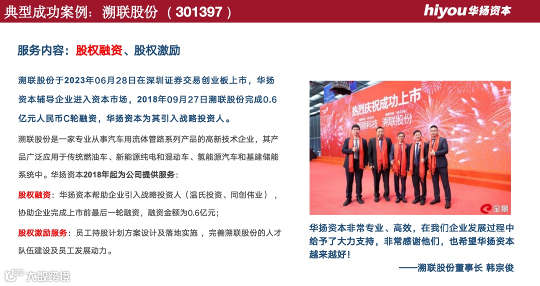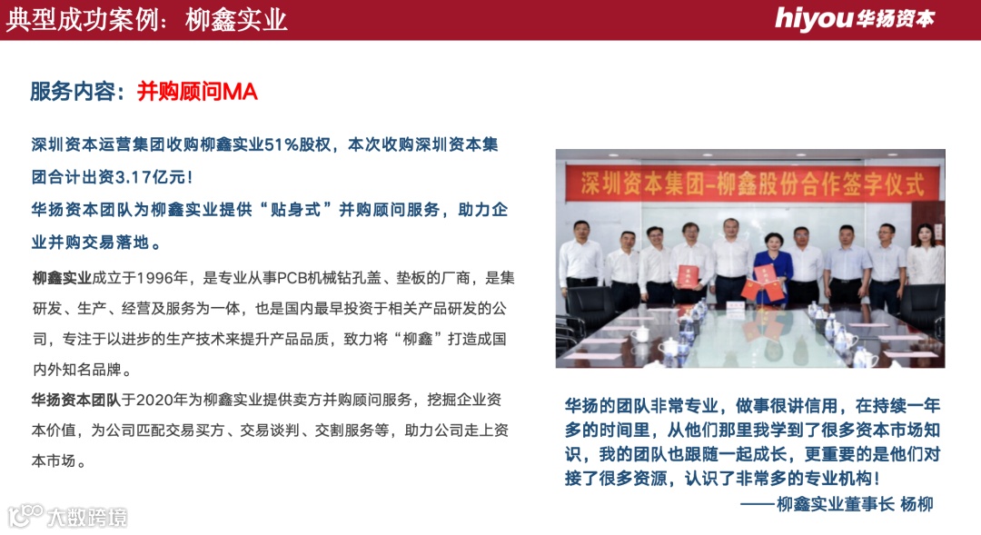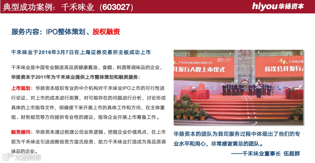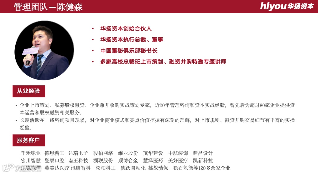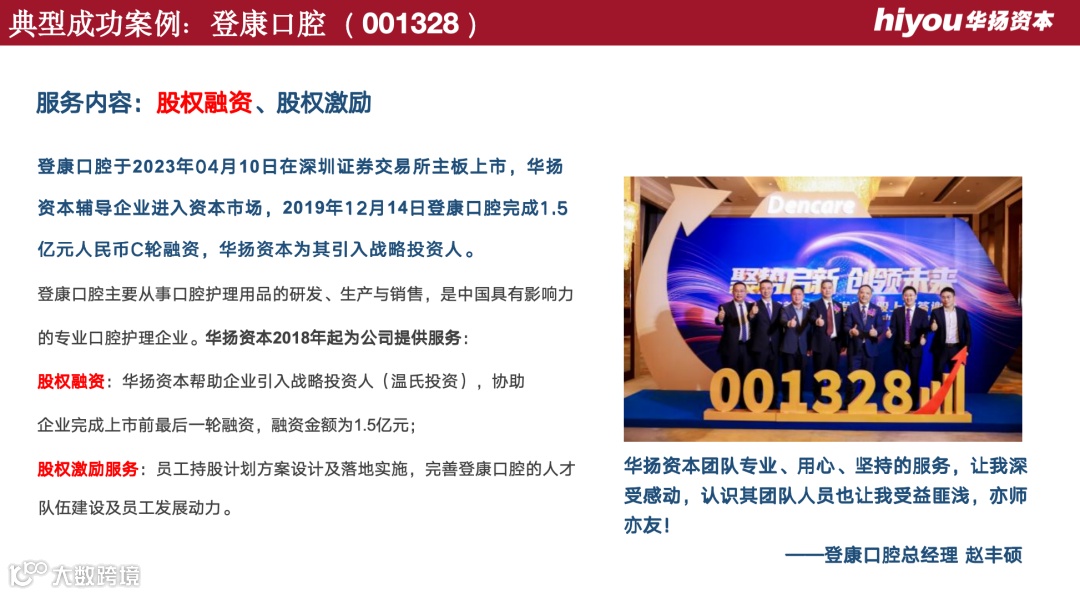 华扬资本团队专业、用心、坚持的服务,让我深受感动,认识其团队人员也让我受益匪浅,亦师亦友! —— 登康口腔总经理 赵丰硕