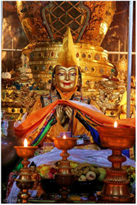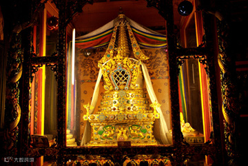 法座被安置在由黄铜包裹的金黄色基座上,它浑身镶嵌着众多的珊瑚、绿松石等珠宝。宝座旁的地面上也铺着厚厚的绸缎,你可不要小瞧了这些绸缎--它们便是著名的甘丹赛赤法帽。