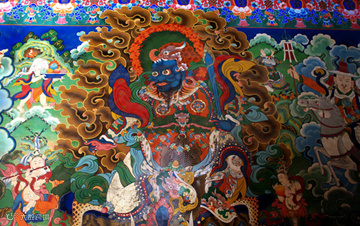 而当我们进入寺庙的主要建筑——措钦大殿时,我们看到,在佛殿内最显眼的位置,供奉着造型精美的宗喀巴祖师像和弥勒佛。措钦大殿面积很大,由108根极粗的石柱支撑着。除了金碧辉煌的佛像之外,林立的幢幡宝盖间,一幅幅精美的佛像唐卡悬挂在墙壁上,当阳光从殿顶的天窗洒进来,照耀在这些巨幅唐卡上,昏暗的殿堂便越发显得神圣而肃穆。