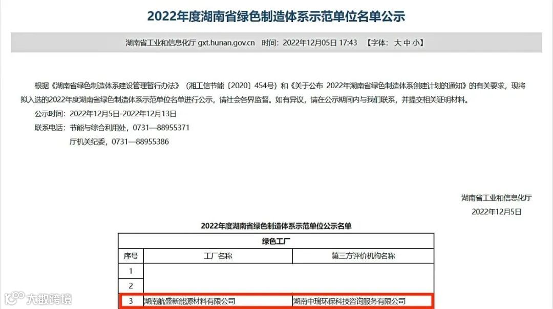 2020年5月,湖南航盛新能源材料有限公司通过湖南省自愿性清洁生产审核评估验收,公司持续加大绿色制造投入,优化资源配置,提高能源利用效率,降低环境负荷,实现绿色可持续发展,最终在2022年底,获得湖南省2022年度“绿色工厂”荣誉,是航盛锂能在绿色发展上取得阶段性胜利的体现。