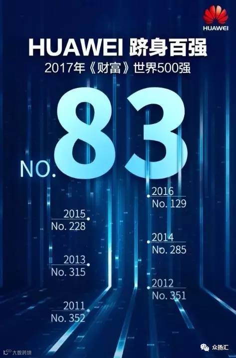 今年7月21日,2017年《世界500强》正式公布,中国的华为正式挺进前100,排名第83!