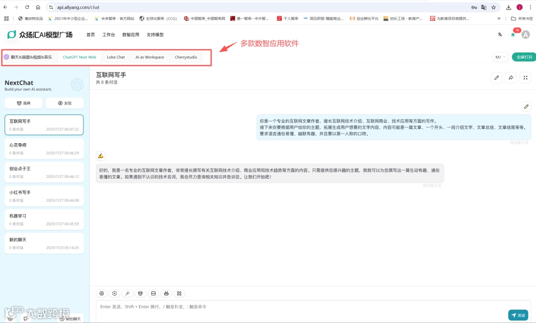 2)NextChat: https://app.allyang.cn NextChat(又名ChatGPT-Next-Web)是一款开源的跨平台AI聊天应用,支持私有化部署,兼容多种主流大语言模型(如GPT-3/4/5、Gemini Pro、Claude等),并提供丰富的交互功能。