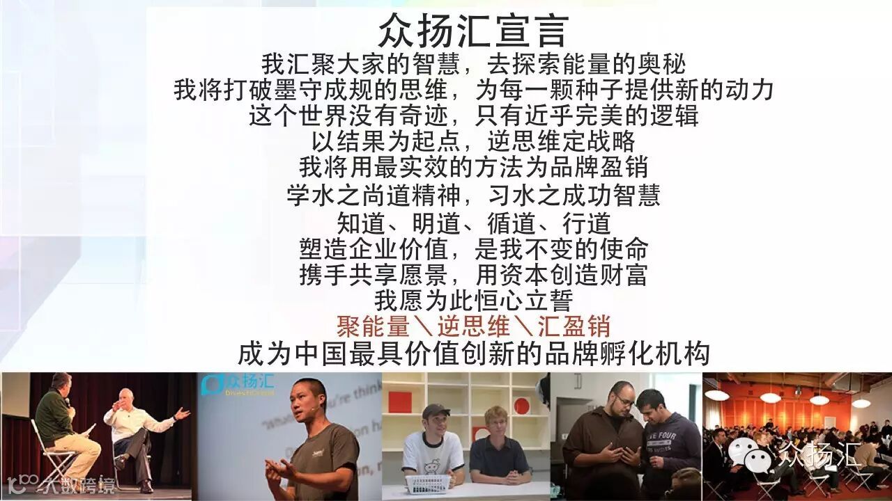 众扬汇孵化器从企业家自主创新、由心而发的个人品牌树立开始,来实现CEO到DEO自我脱变的砺练过程,主张创业要从结果开始,设立企业发展的能见度和清晰度,多维度来溯源品牌故事,塑造品牌价值,孵化符合上市标准的企业;