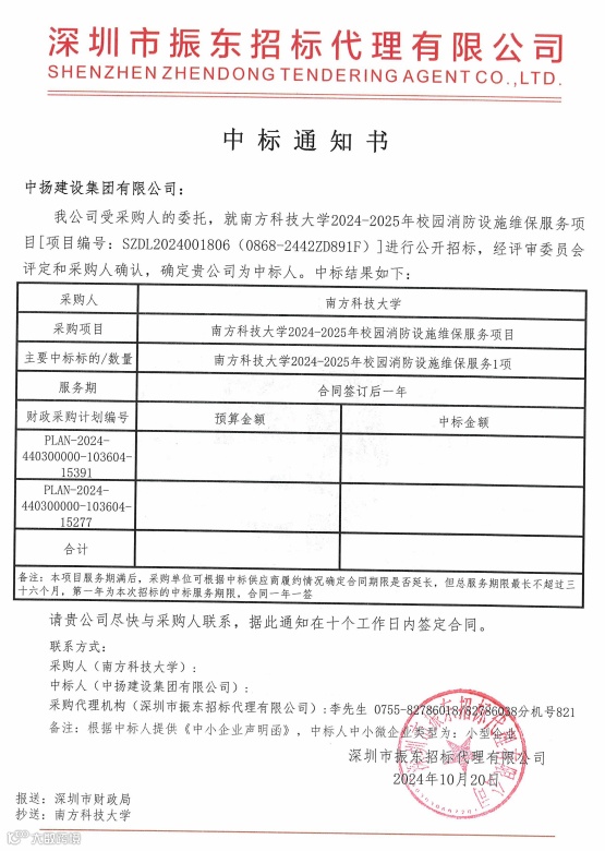 近日,中扬集团捷报频传,2024年10月20日,集团成功中标南方科技大学校园消防设施维保服务项目,这是对我们专业能力和优质服务的高度认可。