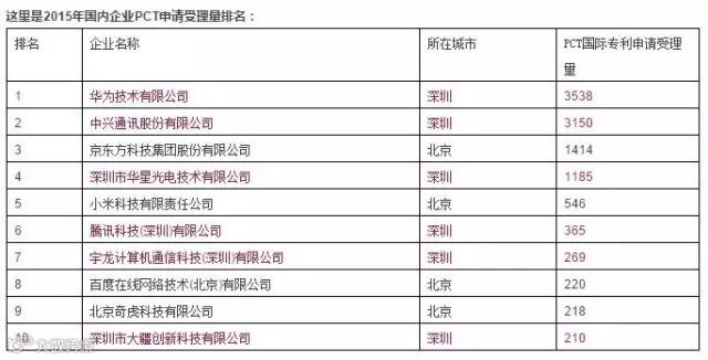 2015年国内企业PCT申请受理量排名,深圳霸占6个席位