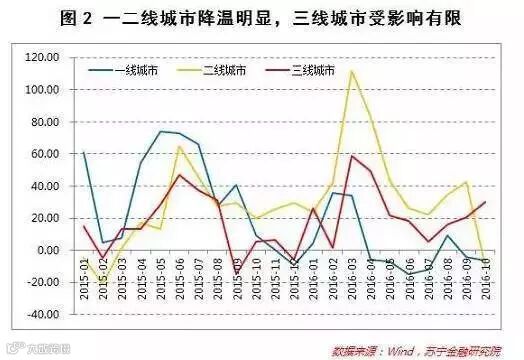 不过这次调控跟以往不同,重点调控热点城市销售,而其余广大三四线城市仍然保持去库存的方向不变,受政策影响有限。根据Wind数据,30个大中城市10月商品房成交套数同比下降0.04%,一二三线城市同比增速分别为-6.54%、-9.61%、30.38%,三线城市房价出现上涨,这回终于有点成绩了。