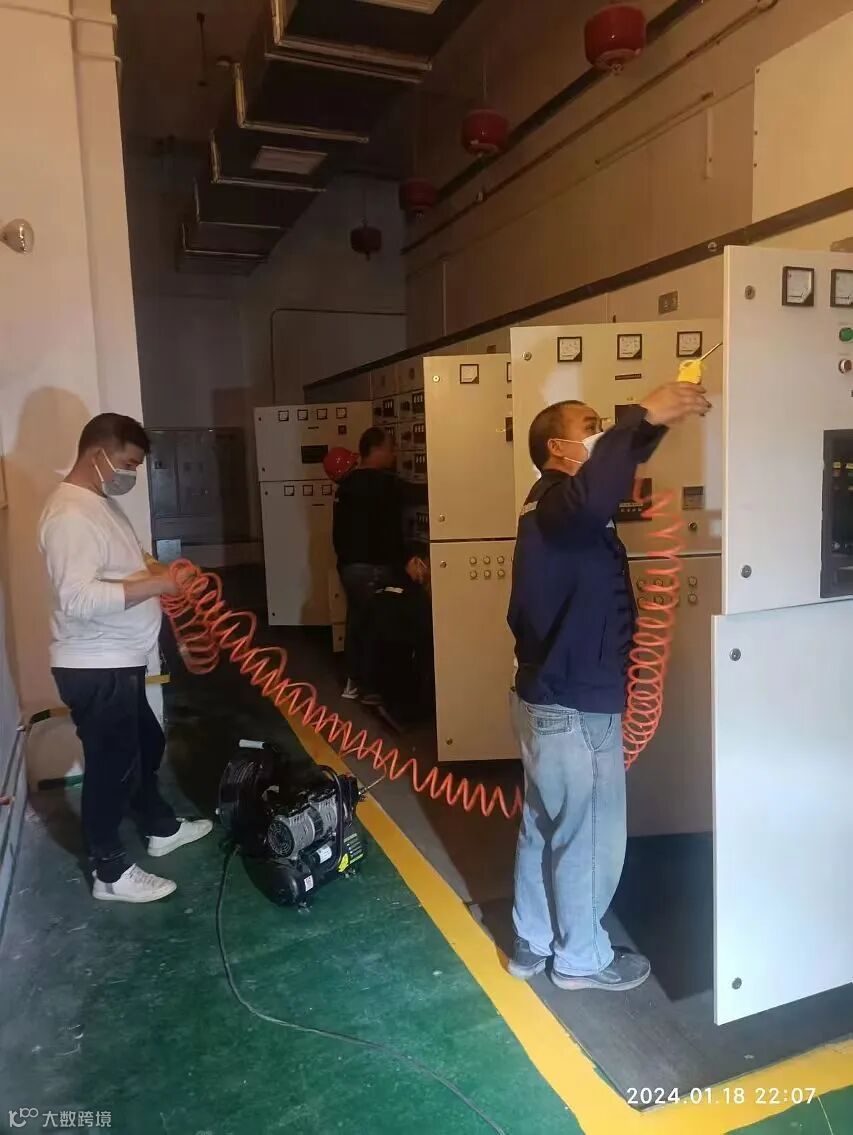 夜晚的楼道,维修师傅逐间检查房间设施,为长者筑牢安全防线。