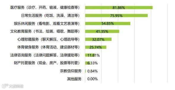 养老机构提供的服务已经从基本的生活照料拓展至医疗服务(81.86%),娱乐休闲(54.85%),文化教育(41.35%)等。