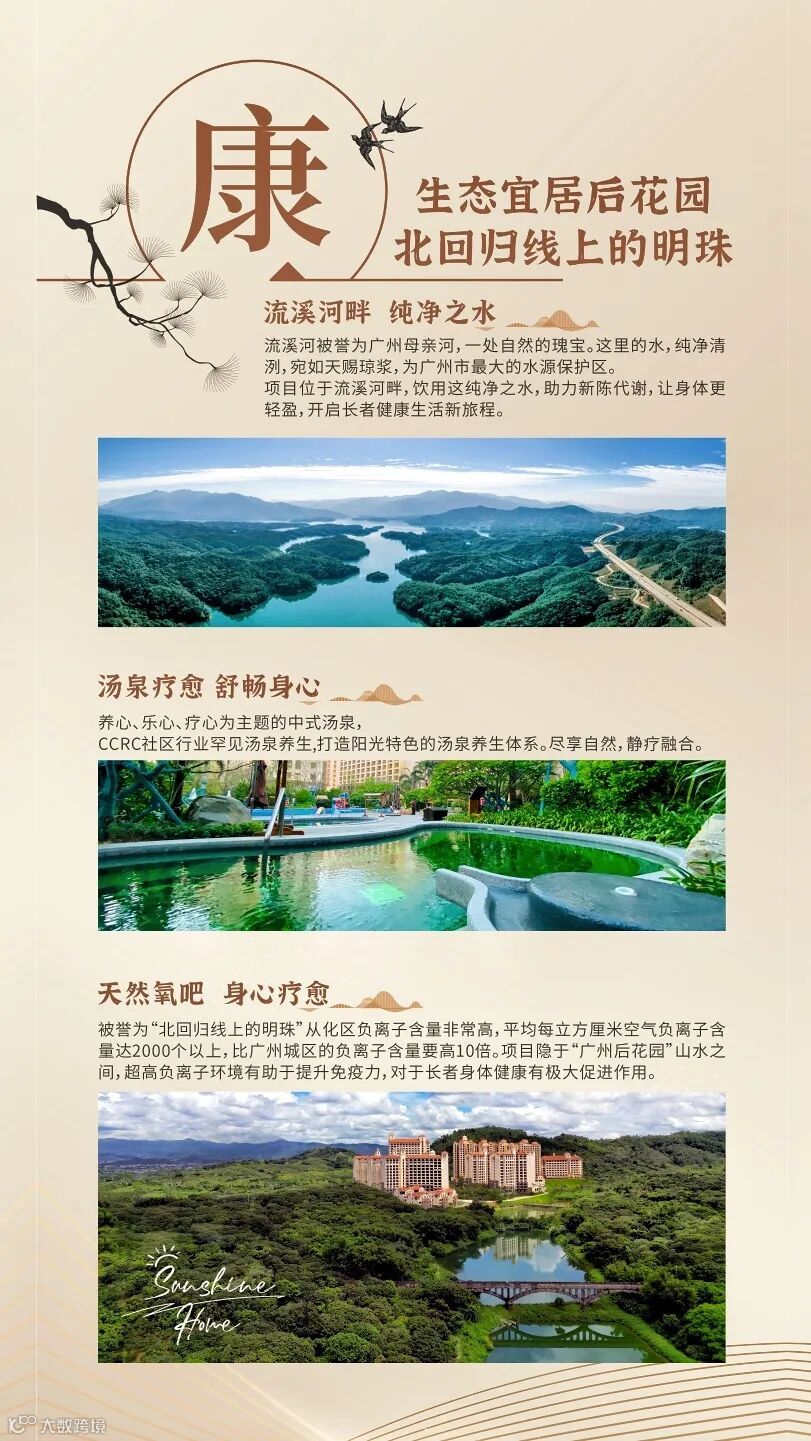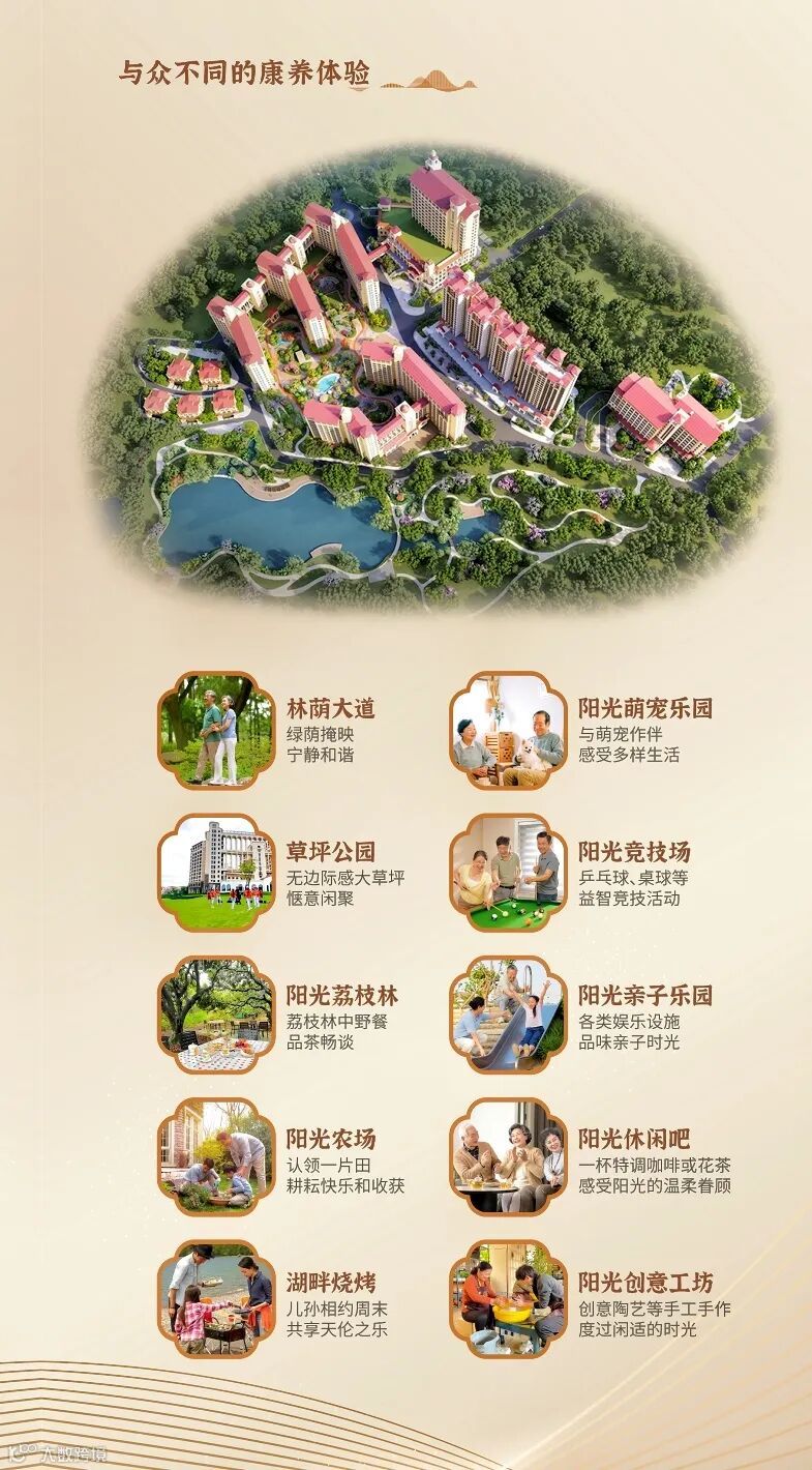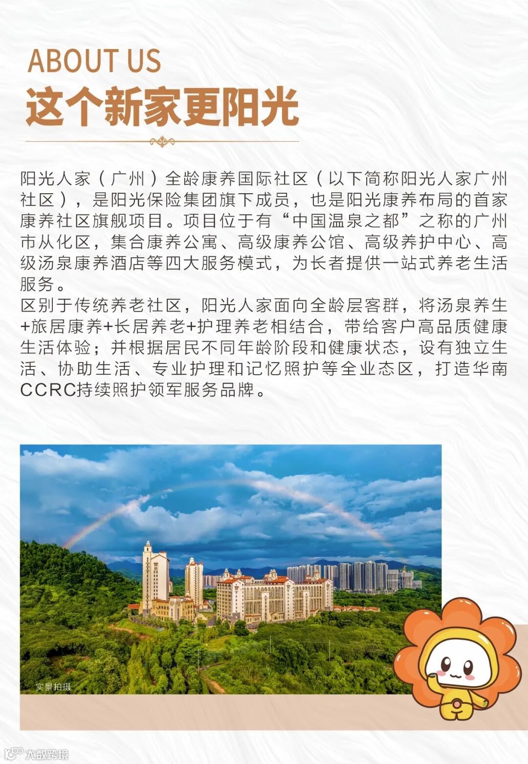 阳光人家广州康养社区,是阳光保险集团旗下成员。社区将汤泉养生+旅居康养+长居养老+护理养老相结合,以充满阳光特色的服务体系打造境养、医养、康养、护养、泉养、食养、居养、学养、农养、乐养等十重高品质享老生活,为全龄客户带来高品质健康生活体验。