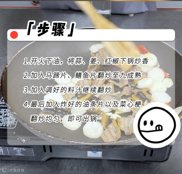 加入马蹄片和鳝鱼片继续翻炒九成熟