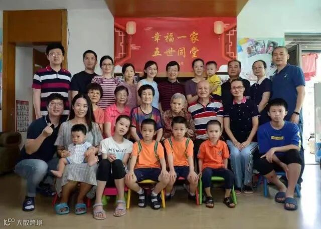 这是一张全家五代同堂欢聚的大合照。第一代是95岁的太太邓雪英(中行左第四人)。她是有66年党龄的中共老党员。她在抗日战争和解放战争时期参加党的外围组织,支持及协助丈夫从事党的地下工作。她在建国后长期从事教育工作,是一名优秀的中学校长。在她的言传身教下,她的第二代、第三代子孙大部分成为中共党员,并成长为不同行业的优秀人才。她的第四代、第五代后人也得以健康成长。邓雪英老太太用自己无私而伟大的爱滋养了几代子孙,子孙们深受其影响,努力认真地把老太太的良好家风代代传承。