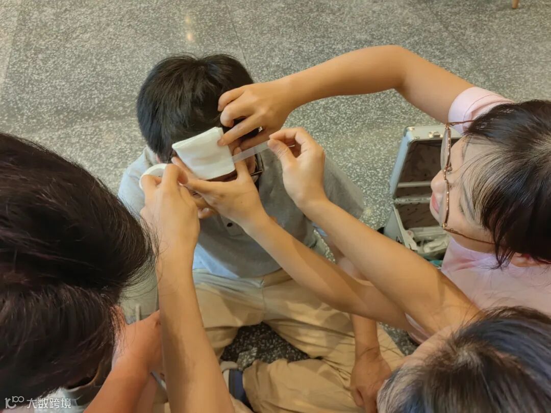 活动管家发现⻓者摔跤,迅速⾛到⻓者身边,安抚情绪,观察身体状态,初步判断伤情,发现⻓者额头少许流⾎,及时⽤⼲净纸⼱⽌⾎;