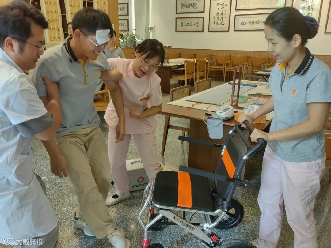 医⽣联系家属:“李叔家属您好,我是阳光人家的医⽣,刚才李叔在参加活动时突然想起身跳舞,⾃⼰在轮椅上站起来时脚步不稳不⼩⼼摔倒了,额头上蹭破⽪流了点⾎。