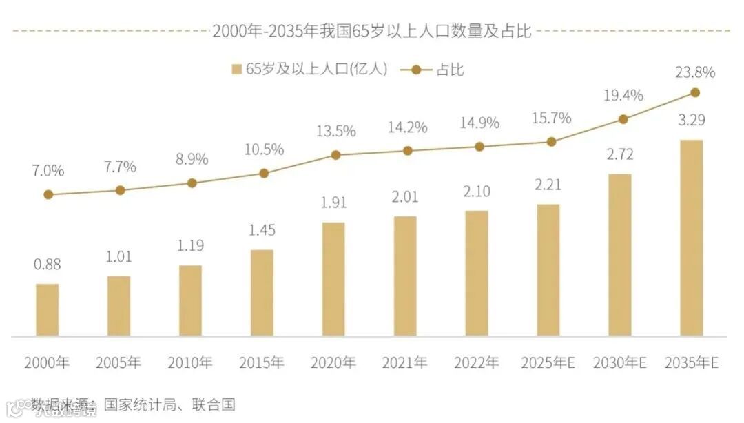 截至2022年底,我国65岁以上人口达到2.1亿人,近五年的复合增长率约为5.9%。