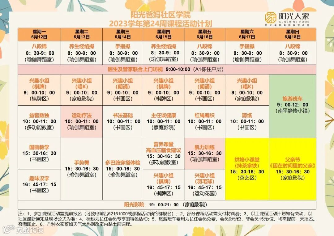 第24周阳光人家课程活动计划上新啦,阳光爸妈社区学院精彩课程活动也火热开展中,欢迎各位阳光爸妈前来康养入住体验!