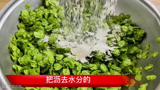 2、把沥去水份的榆钱放入盆中,加适量面粉或玉米面,使每片榆钱上都要沾上面粉即可。