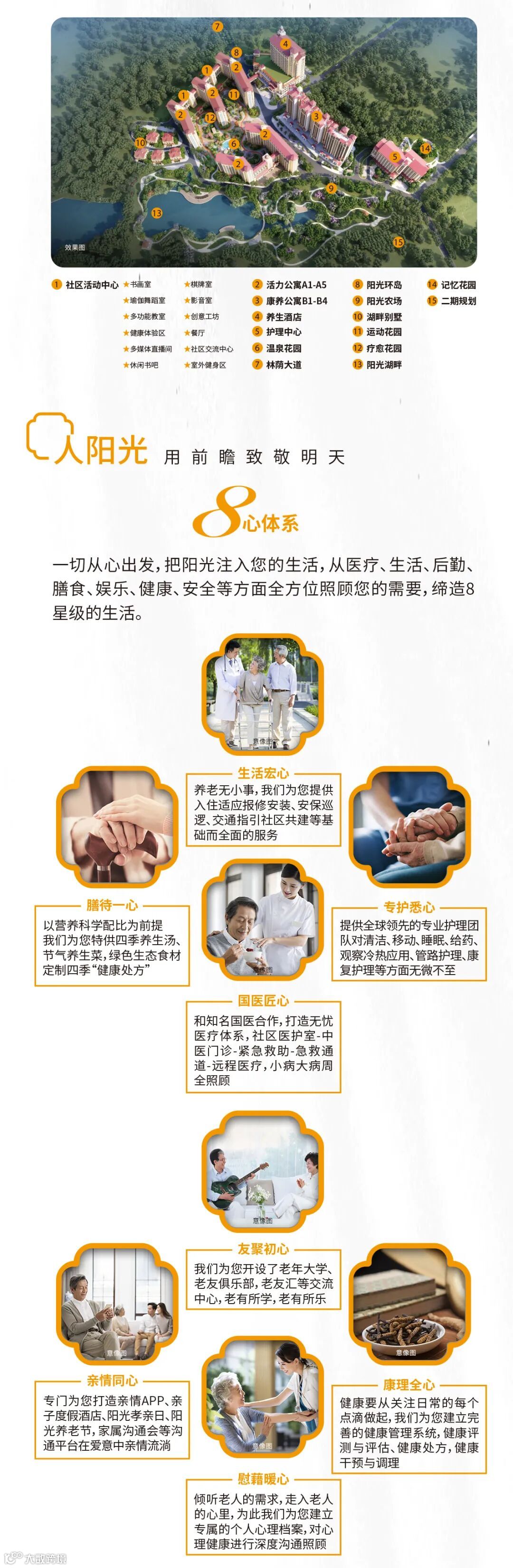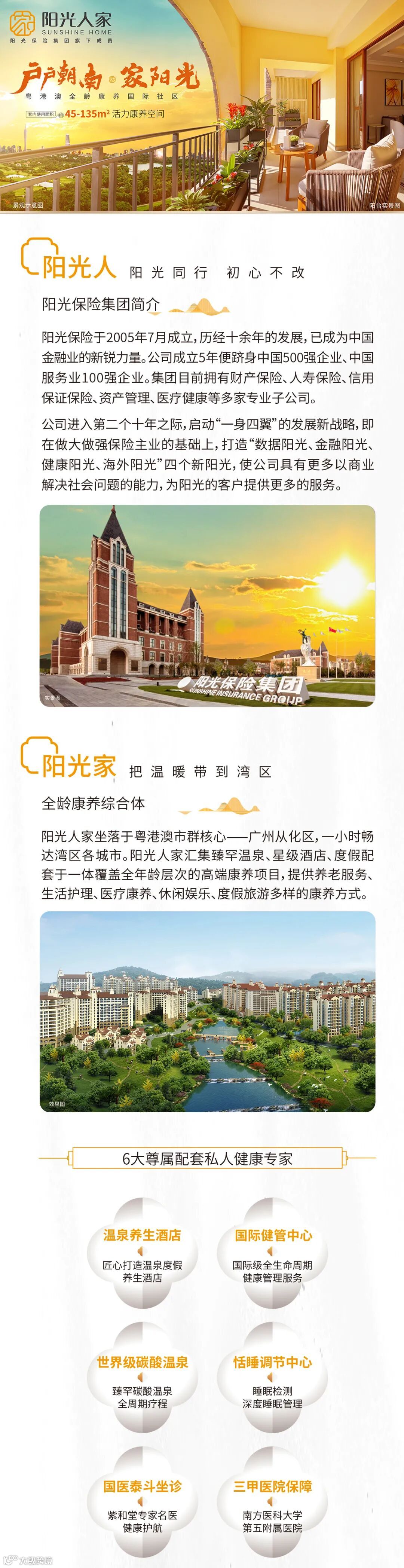 阳光人家广州康养社区,是阳光保险集团旗下成员。社区将汤泉养生+旅居康养+长居养老+护理养老相结合,以充满阳光特色的服务体系打造境养、医养、康养、护养、泉养、食养、居养、学养、农养、乐养等十重高品质享老生活,为全龄客户带来高品质健康生活体验。