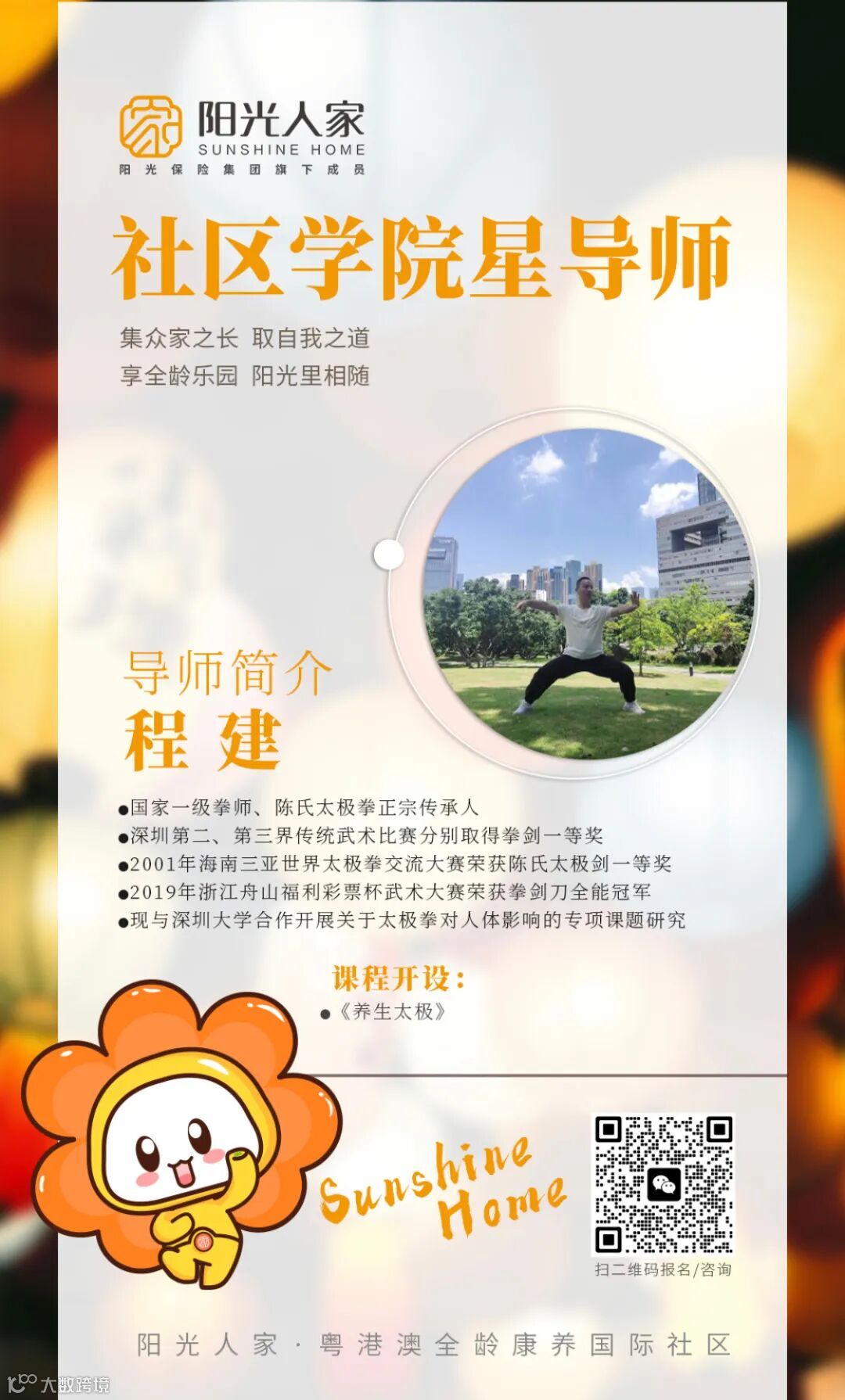 本次《养生太极》课程,由社区学院星导师——程建导师亲自教授。太极拳有增强体质、提高免疫力、减脂减重等好处,经常练习能提高心肺功能、增加血管弹性、促进血液循环等。