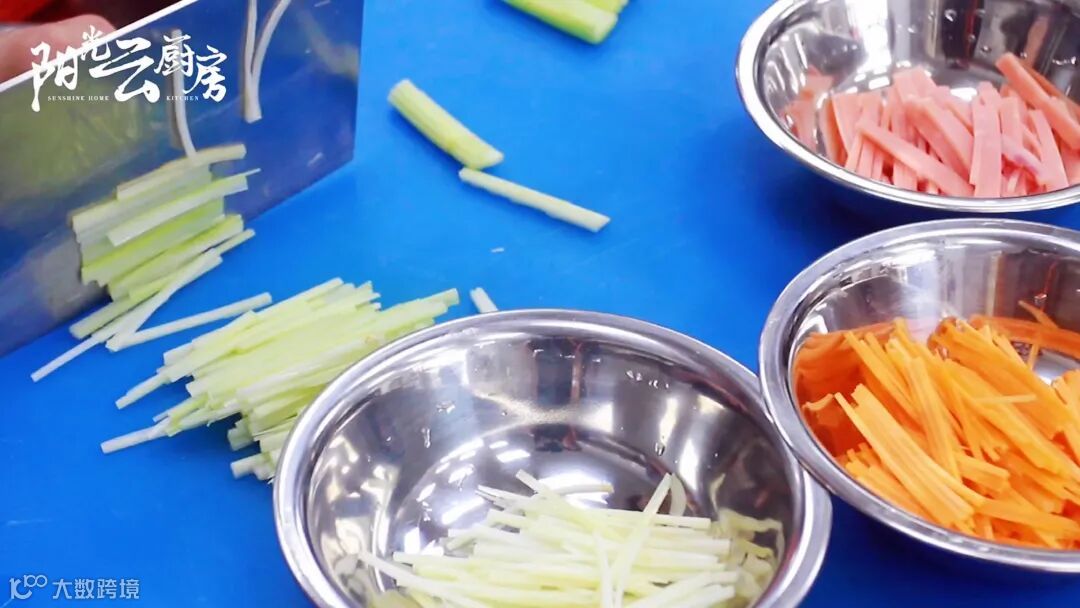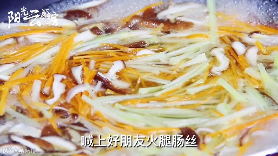 先后将冬菇丝、胡萝卜丝、芹菜丝