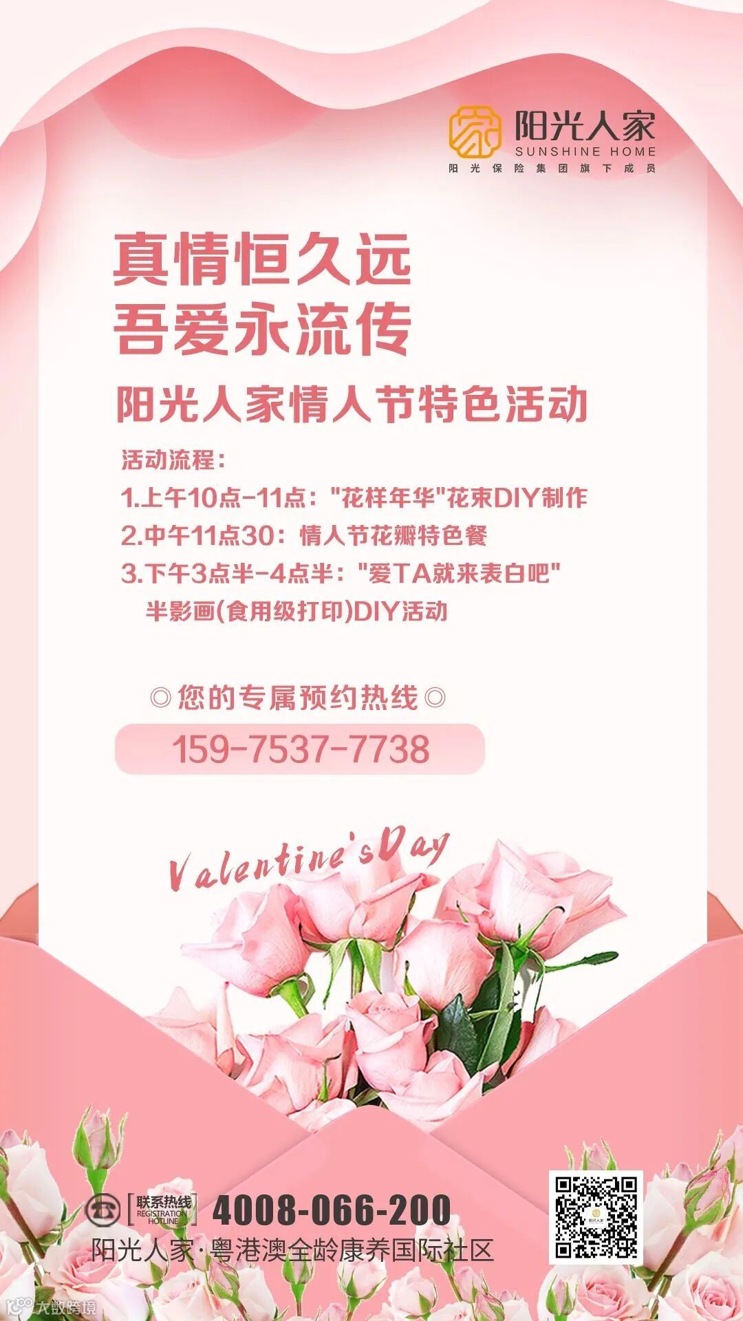 情人节当天(2月14日)阳光人家社区精心策划了特色活动,有对象的带上对象,没对象带着家人或朋友,一起来快乐过节吧。