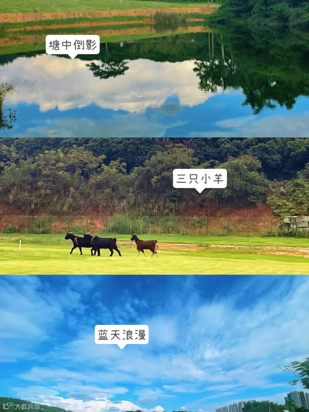 在这个幸福的社区,这片草坪是被人私藏的赏秋好去处。天空的云朵变化万千,在鱼塘中倒影出自己的美,不时有三两行人走过,又偶尔三两小羊奔跑。